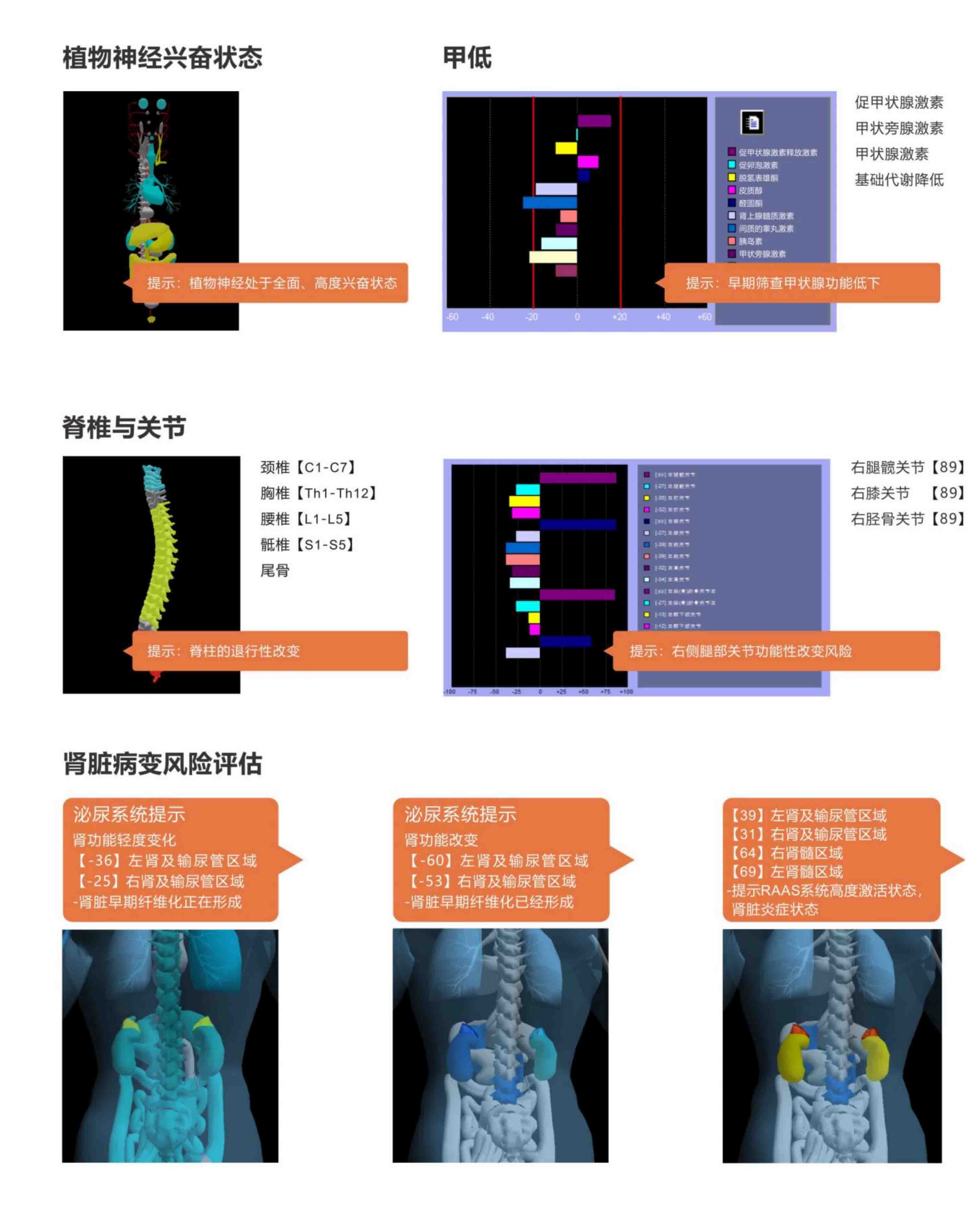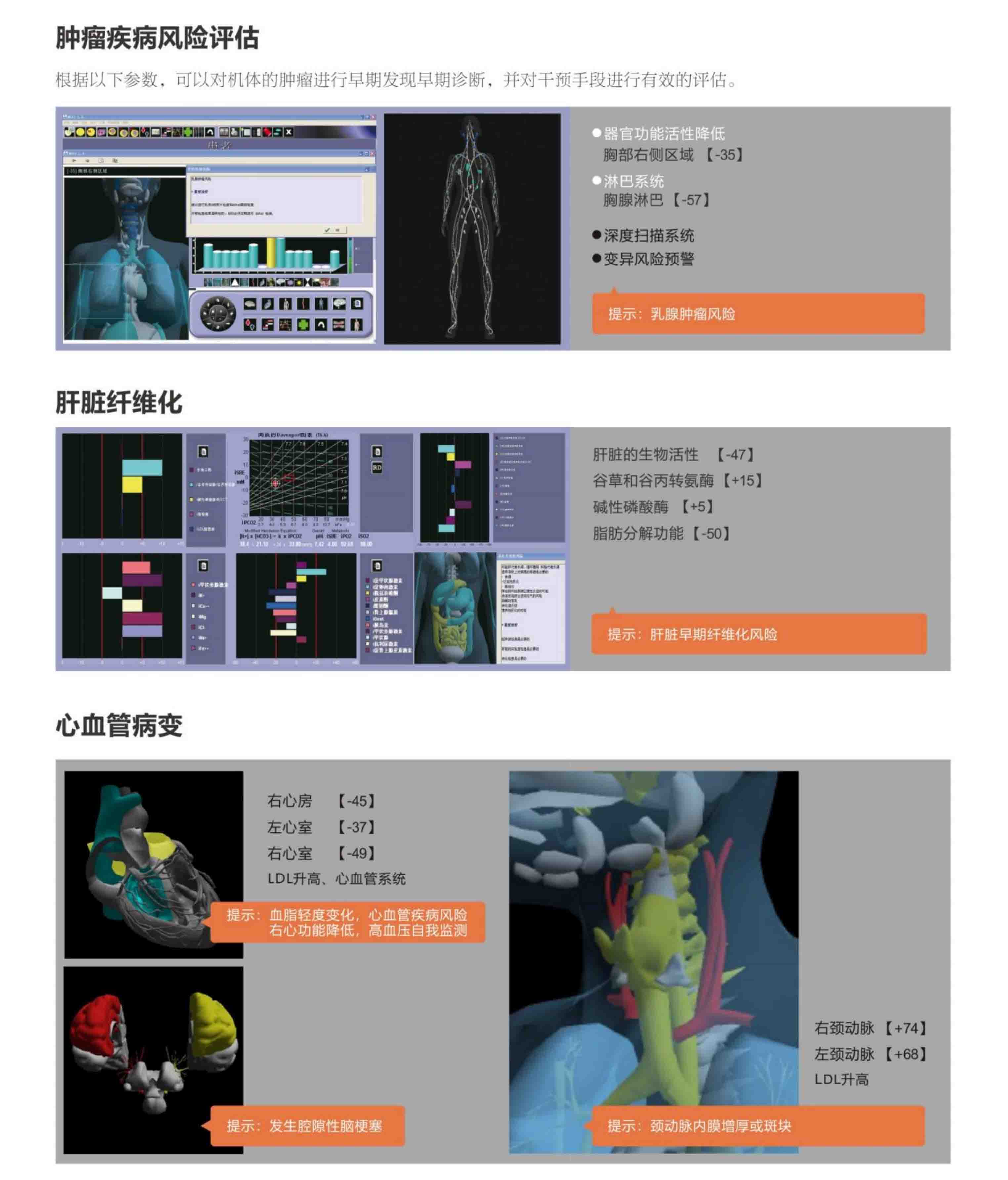 這些信息被用于評估人體各臟器的間質細胞的電生理活性。系統通過即時電流分析法,將這些生理反饋信號進行數字化處理,并以3D成像的方式,形成全身各個部位的三維圖象。這一技術不僅全面覆蓋了人體的各個系統、組織、器官,還能夠在機體各器官、組織、系統、代謝狀態等處于功能性病變階段時,就發現潛在的健康問題。